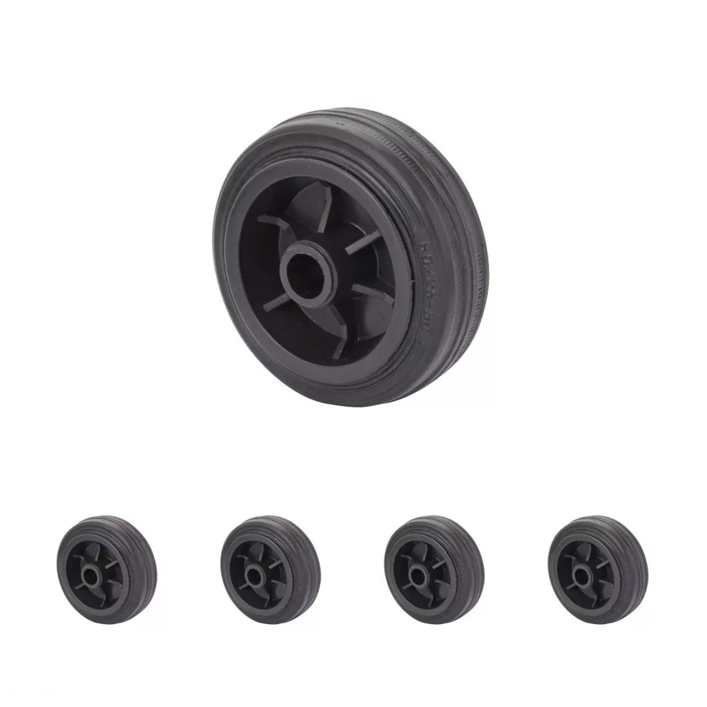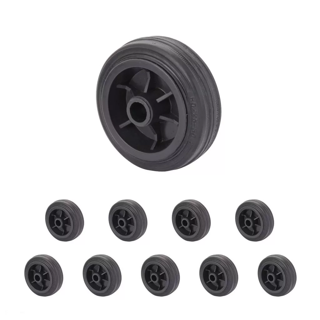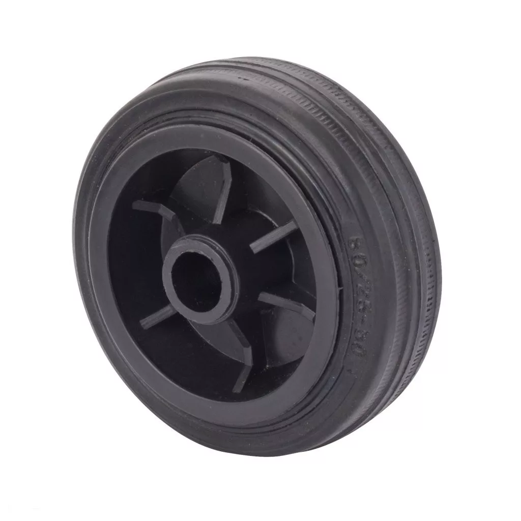 80 mm átmérőjű, 50 kg dinamikus teherbírású, 25 mm széles fekete gumi futófelülettel rendelkező műanyag szállítókerék. Tengelyfurat átmérője 12 mm, agyhossz 39 mm. Fekete műanyag tárcsa.