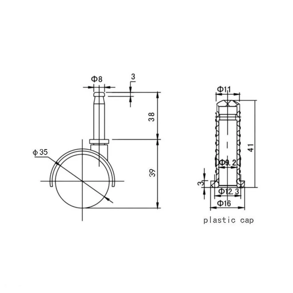 35 mm átmérőjű, csapos bútorgörgő. Puha padlóra tervezve, teherbírása akár 50 kg.