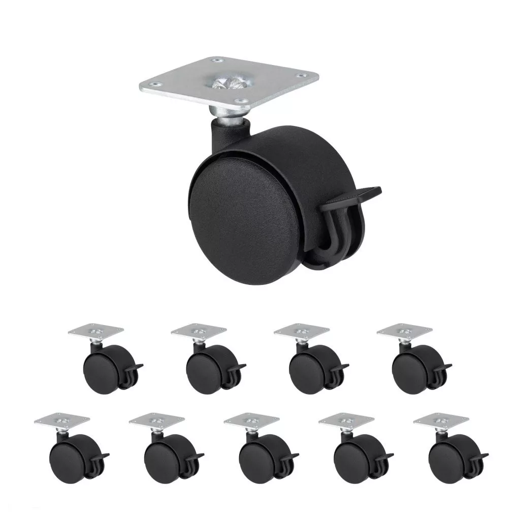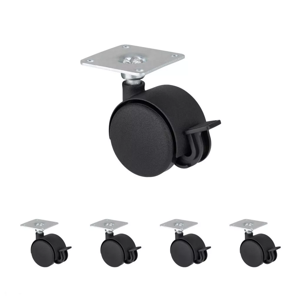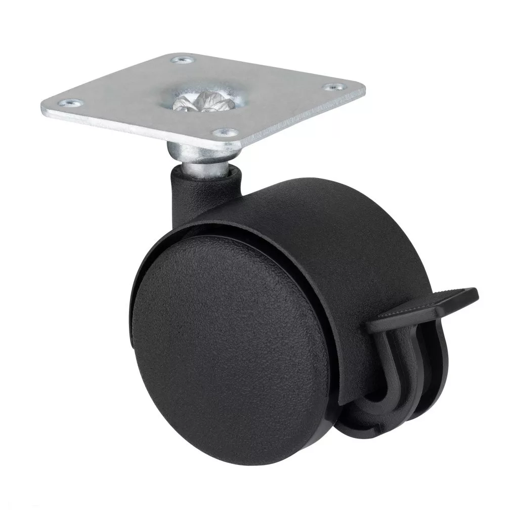 Fekete, teljesen műanyag dupla kerék fékkel, 40 mm átmérőjű, dinamikus teherbírás akár 25 kg. Kerékmagasság 60 mm, talpméret 42 x 42 mm. Görgők puha padlóra.