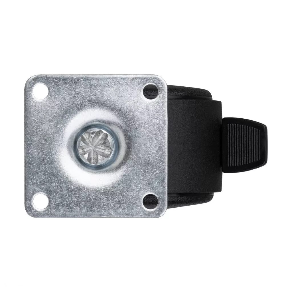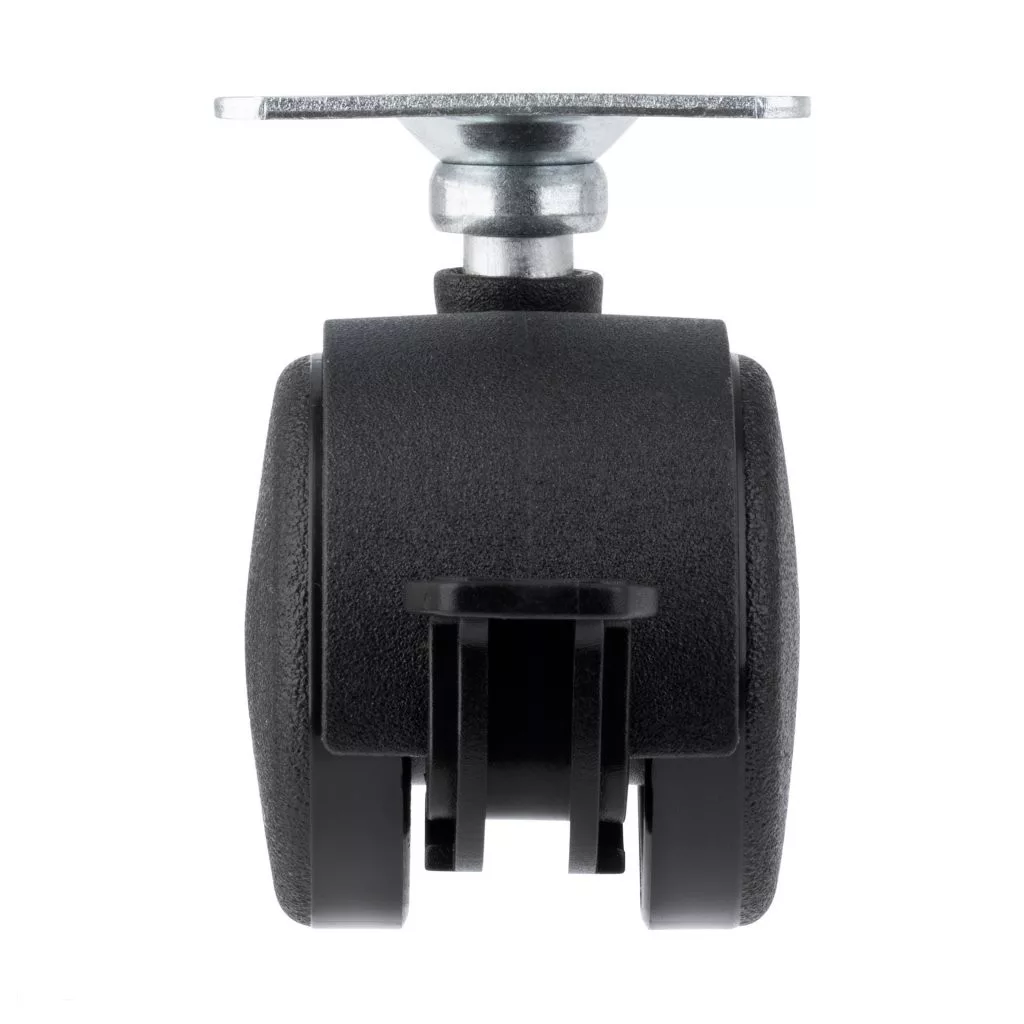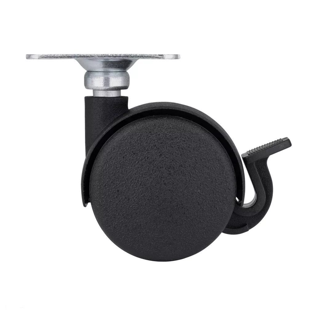 Fekete, teljesen műanyag dupla kerék fékkel, 40 mm átmérőjű, dinamikus teherbírás akár 25 kg. Kerékmagasság 60 mm, talpméret 42 x 42 mm. Görgők puha padlóra.