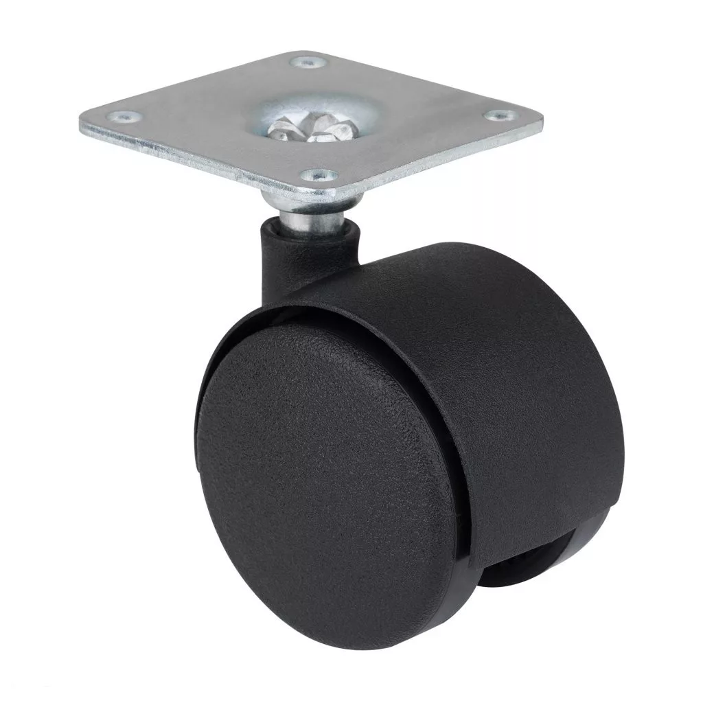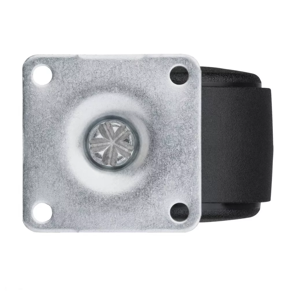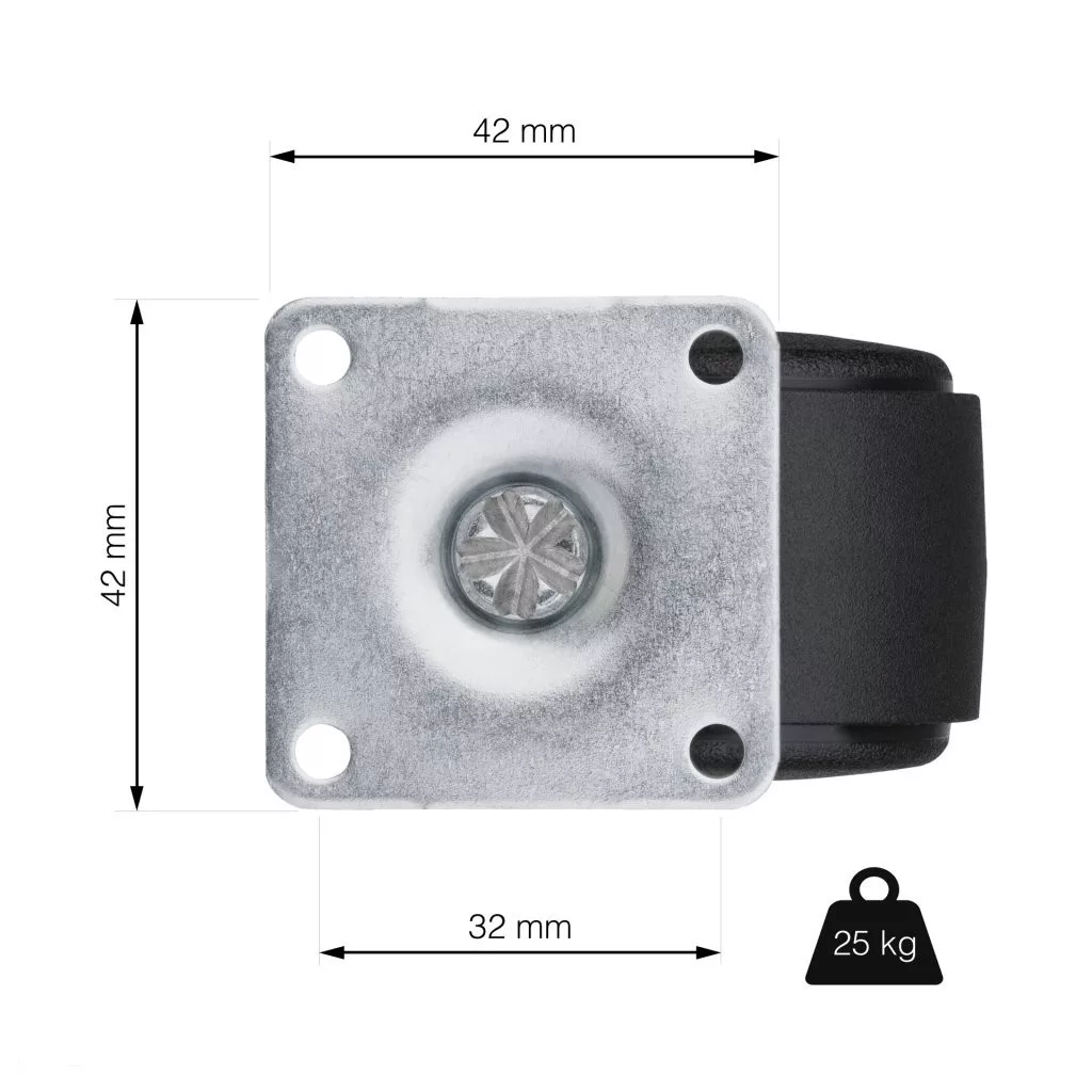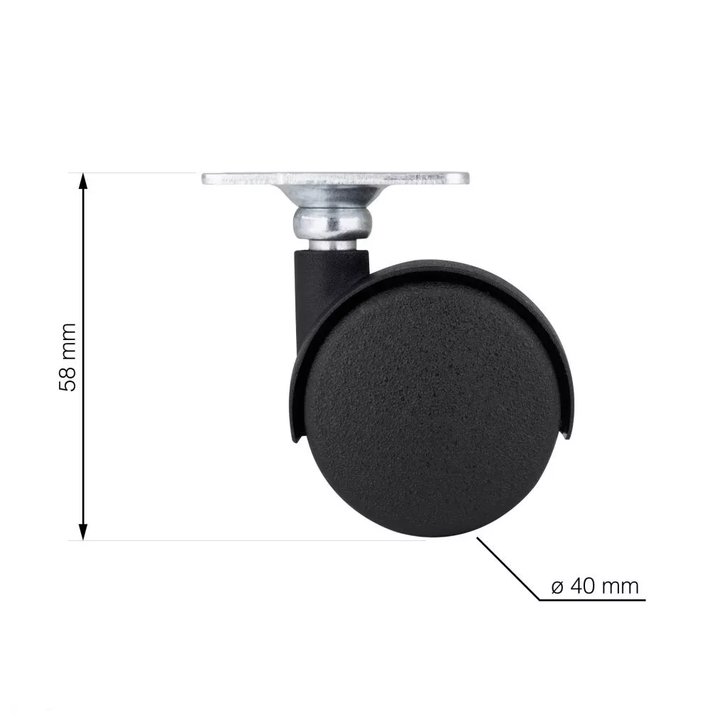 Fekete, forgó bútorkerék, 40 mm átmérővel, akár 25 kg dinamikus teherbírással. Kerékmagasság 58 mm, 42 x 42 mm méretű talppal. Puha padlóra való görgők.