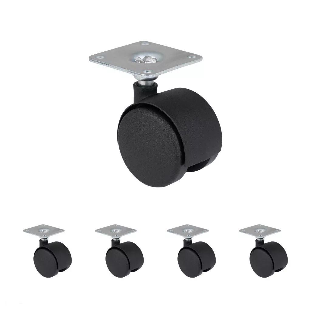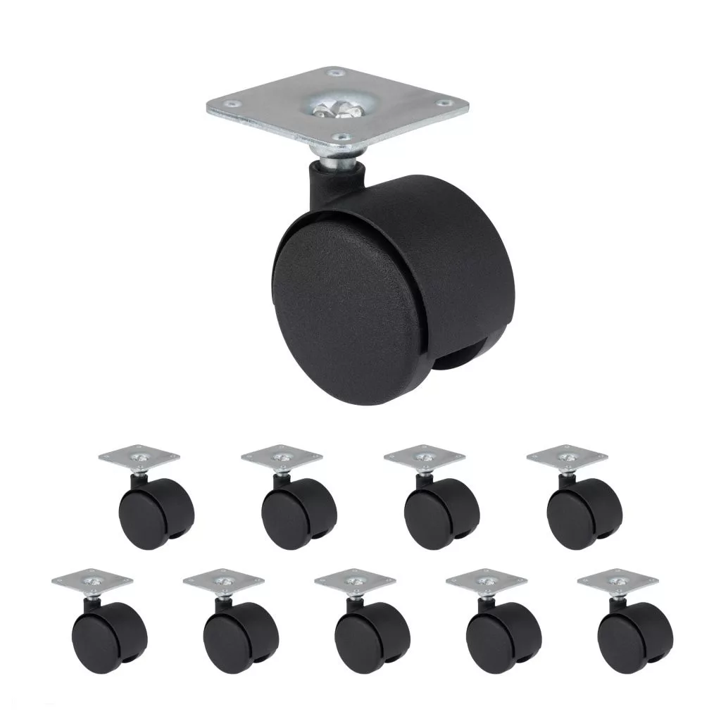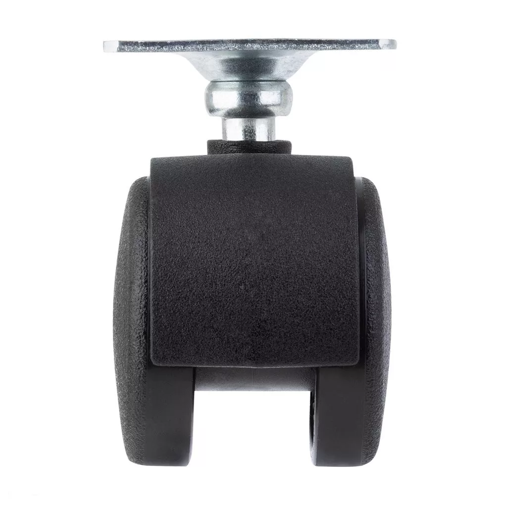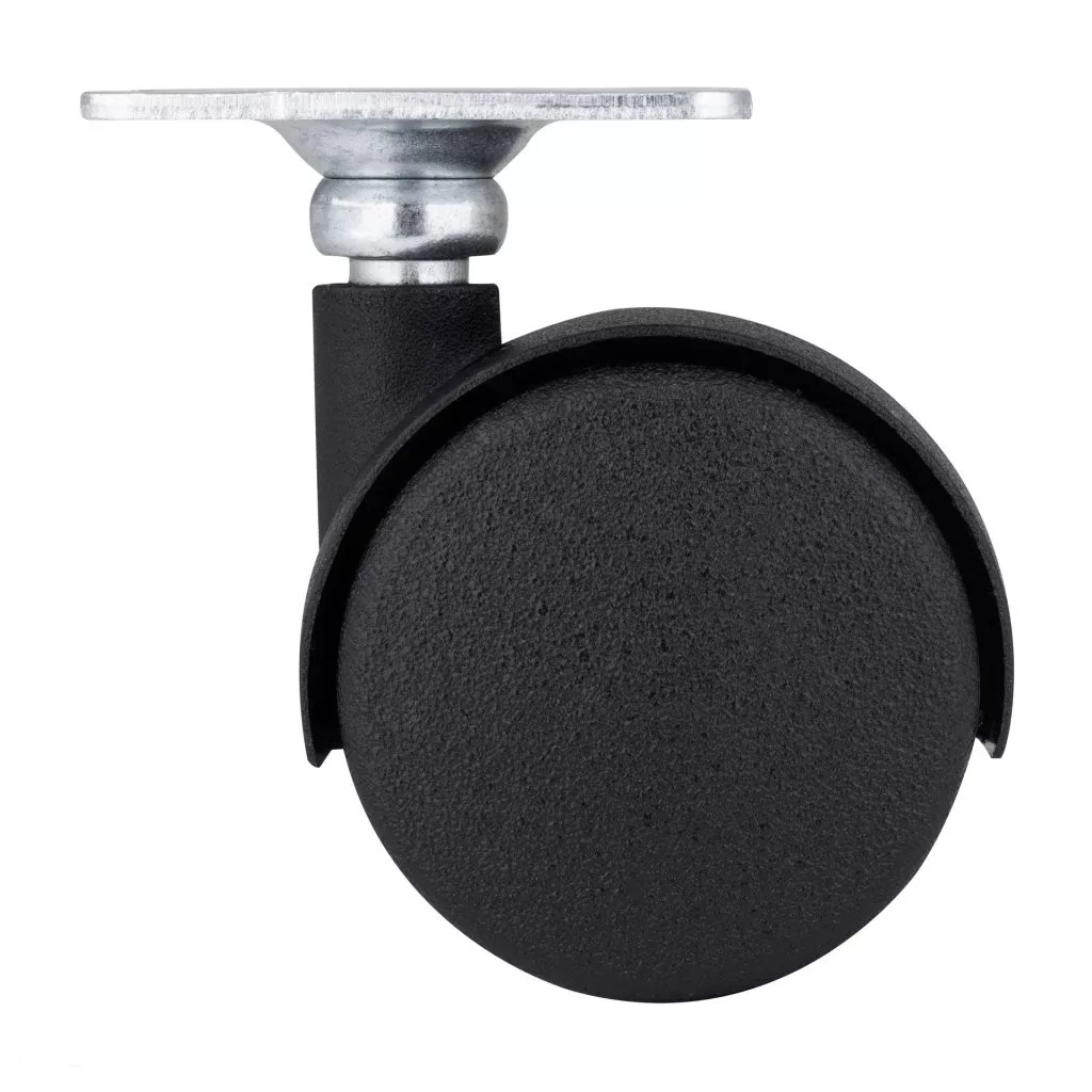 Fekete, forgó bútorkerék, 40 mm átmérővel, akár 25 kg dinamikus teherbírással. Kerékmagasság 58 mm, 42 x 42 mm méretű talppal. Puha padlóra való görgők.