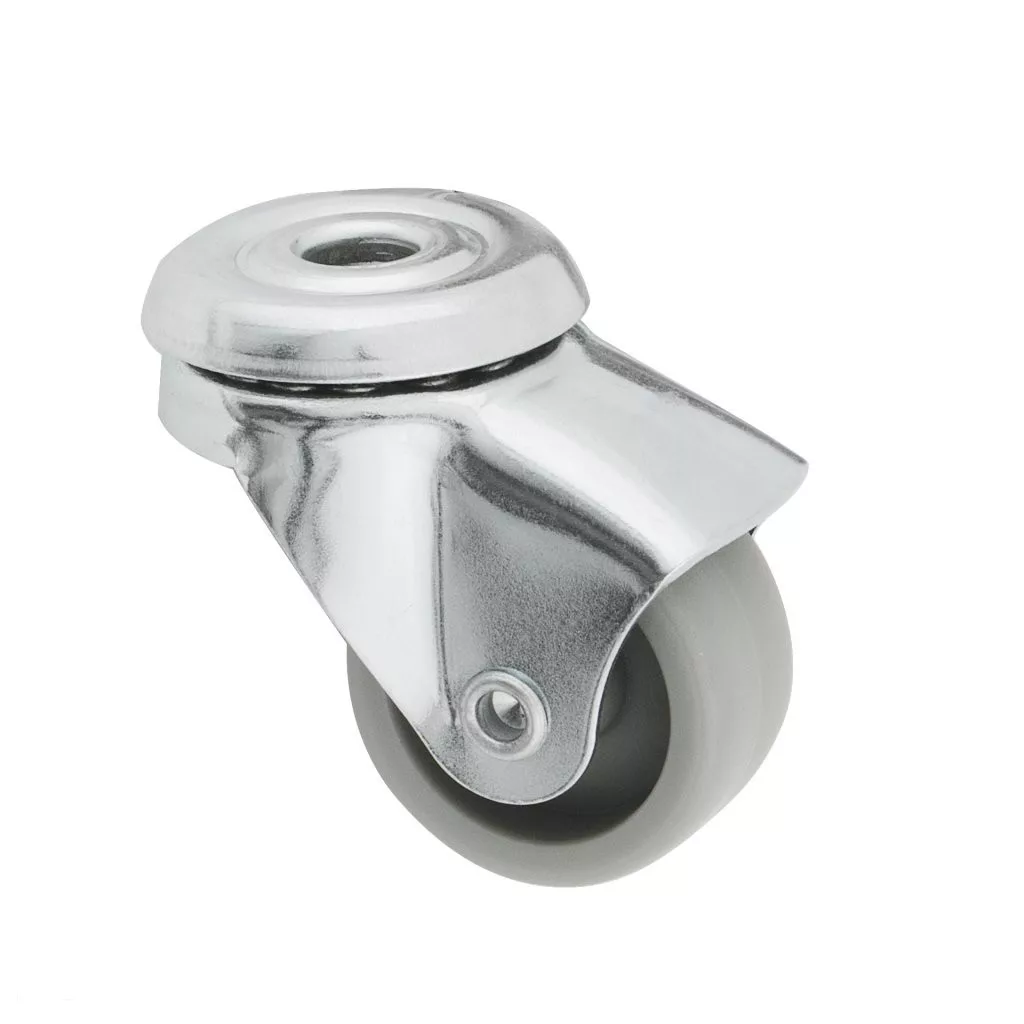 Forgógörgő 30 mm átmérőjű furattal és 25 kg dinamikus teherbírással. A görgő teljes szerkezeti magassága 45 mm. Puha padlóra tervezve.