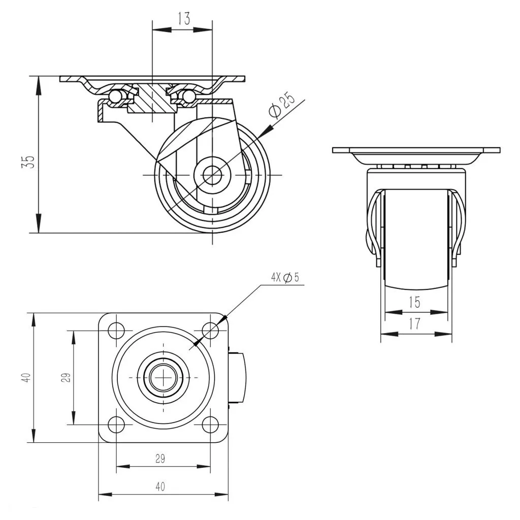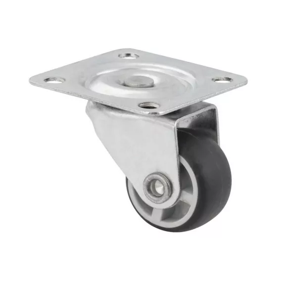 25 mm átmérőjű készülékkerék 15 kg dinamikus teherbírással. A kerék magassága 34 mm, a tányér mérete 40 x 40 mm. Kemény padlóra tervezve.