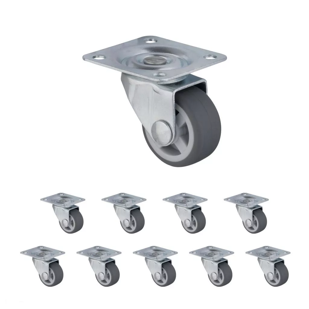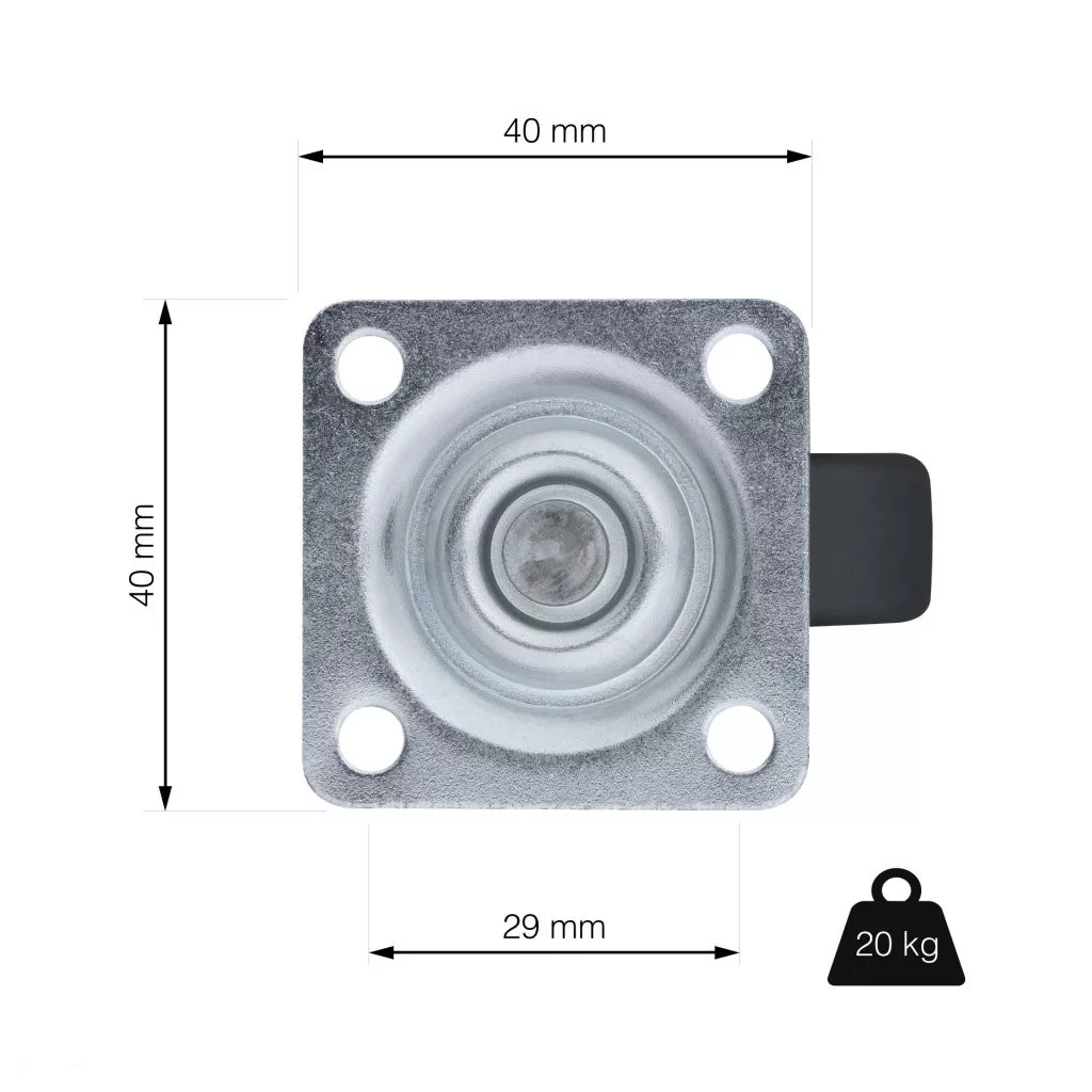 30 mm átmérőjű készülékkerék 20 kg dinamikus teherbírással. A kerék magassága 38 mm, a tányér mérete 40 x 40 mm. Kemény padlóra tervezve.
